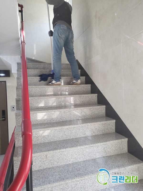 계단청소를 할때는 계단 손잡이 봉이나 난간 등에 쌓인 먼지들도 닦아주고 소독수를 뿌려 위생적으로 관리를 해드리고 있습니다.
